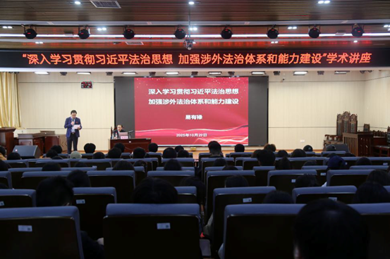 本站讯(学生通讯员 周倩倩 王飞宇 朱雨坤)为深入学习贯彻习近平法治思想,拓展学生学术视野,夯实专业基础,10月29日下午,政法学院在新模拟法庭举办“深入学习贯彻习近平法治思想,加强涉外法治体系与能力建设”学术讲座。讲座特邀江西财经大学法学院院长易有禄教授主讲,由政法学院院长黄心华主持,200余名师生参加。