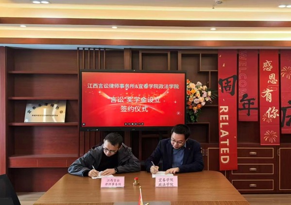 本站讯(学生通讯员 黄旭丹)2025年11月7日上午,宜春学院政法学院党委书记江海华、院长黄心华、党委副书记彭农乐、副院长罗许生一行赴江西言讼律师事务所开展访企拓岗合作交流,并成功签署《“言讼”奖学金设立合作协议》,政法学院学生工作办公室(团委)主任彭东陪同参加。律所主任游志荣、执行主任李平、律师丁小琼、陈淑文、张鑫等热情接待了学院到访,双方围绕“言讼奖学金”设立、深化校企实践合作等事宜深入座谈。