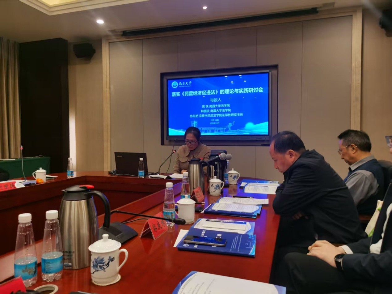 本站讯(学生通讯员 周倩倩)2025年12月13日至14日,由南昌大学社会科学处、南昌大学法学院等多单位联合主办,江西萃星智能科技有限公司、北京天驰君泰(南昌)律师事务所等单位协办支持的“落实民营经济促进法的理论与实践研讨会”在南昌召开,来自全国高校法学专家、司法实务界代表齐聚一堂,围绕《中华人民共和国民营经济促进法》的落地转化展开深度研讨。我院法学教研室主任、副教授陈红艳参加此次研讨会并作为与谈人发言。