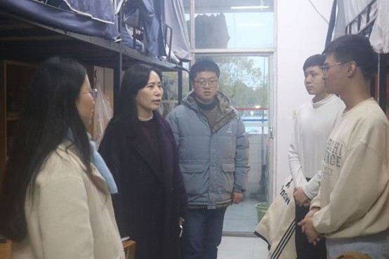 走访过程中,老师们逐间检查宿舍卫生、排查宿舍安全隐患,叮嘱学生严格遵守宿舍安全规定,规范用电行为、做好个人防护,共同营造安全文明的宿舍环境;与同学们亲切交流,详细了解新学期学业规划、就业进展及生活困难,并勉励同学们科学规划新学期目标,夯实专业基础、积极参与社会实践,锤炼过硬本领;针对部分宿舍提出的热水供应不稳定、书桌损坏等问题,现场对接相关部门,确保诉求快速响应、问题高效解决。