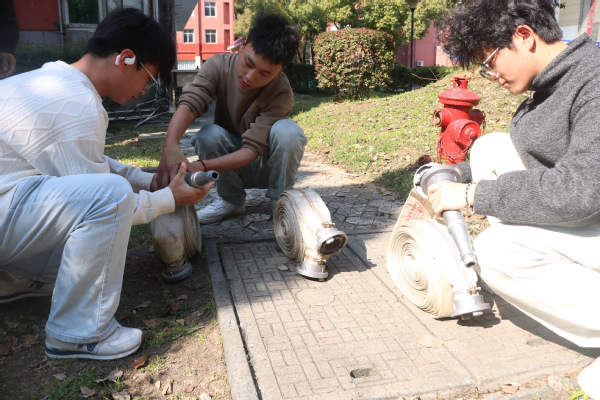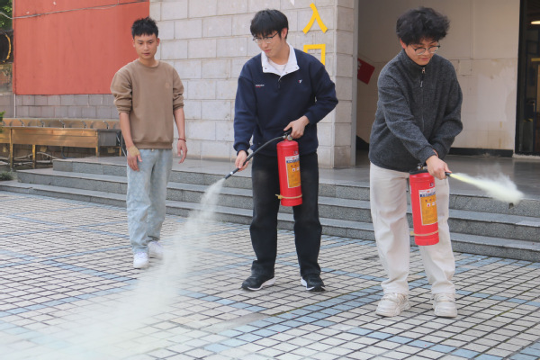 全员安全撤离后,赵振宇组织学生前往大学生活动中心旁空旷场地,现场观摩学校保卫处专业人员开展的消防器材实操教学。安保人员结合实物拆解演示,逐一讲解干粉灭火器、室内外消防栓等常见消防设备的适用场景、操作要领与使用规范,现场指导学生代表依次完成灭火实操演练,帮助学生切实掌握初期火灾处置核心技能,有效增强了面对突发火情时的心理素质与实操应对能力。